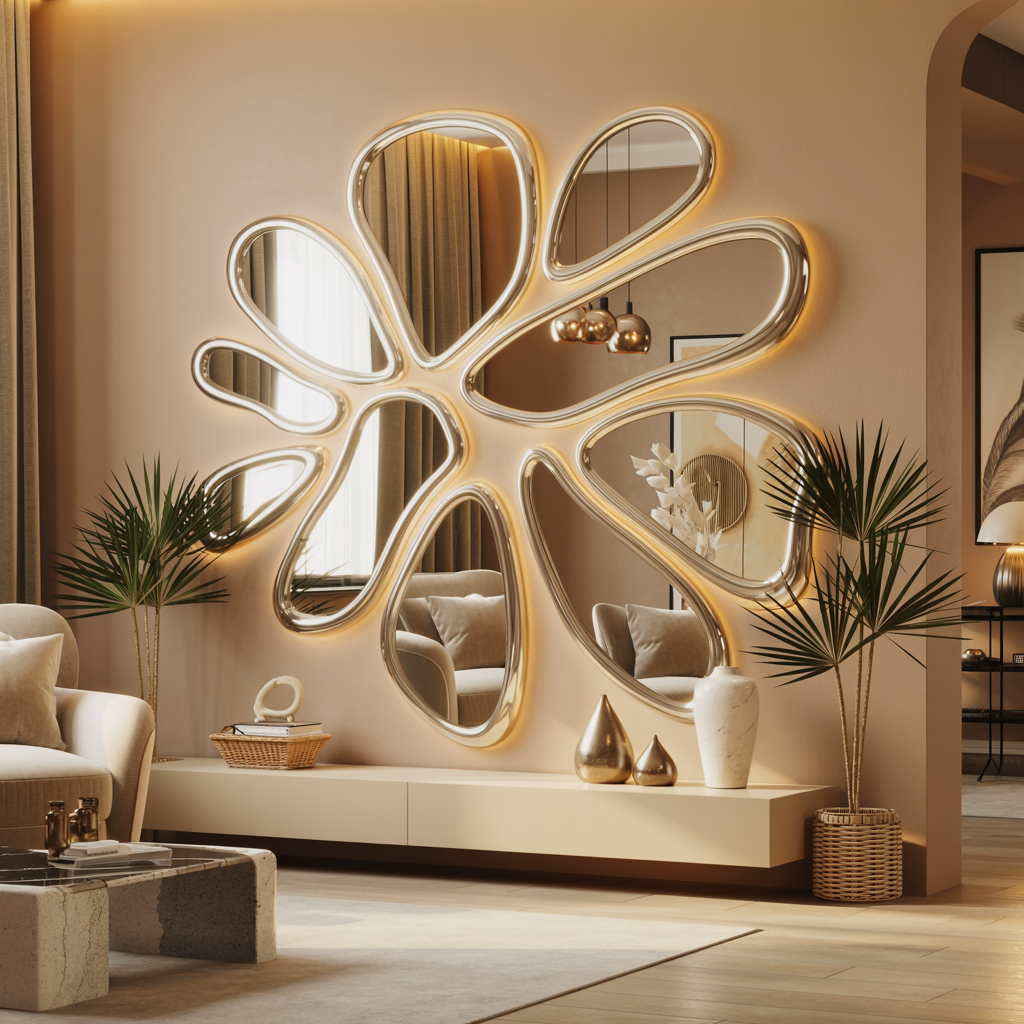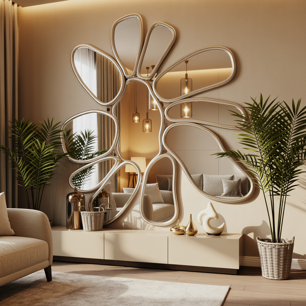 Irregularly shaped mirrors are a standout choice for anyone seeking cheap mirror decoration ideas that don’t sacrifice style. They blend form and function, offer visual impact, and support various design themes from cozy and boho to clean and contemporary.